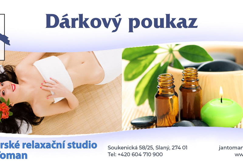 Vážení zákazníci, v našem Masérském relaxačním studiu si lze zakoupit: Dárkové poukazy dle vašeho výběru na jakékoliv služby v našem masérském relaxačním studiu Jan Toman. Poukazy po domluvě lze také zaslat emailem a následně zaplatit bankovním převodem. Instrukce budou uvedeny pod Dárkovým nebo vánočním dárkovým poukazem.